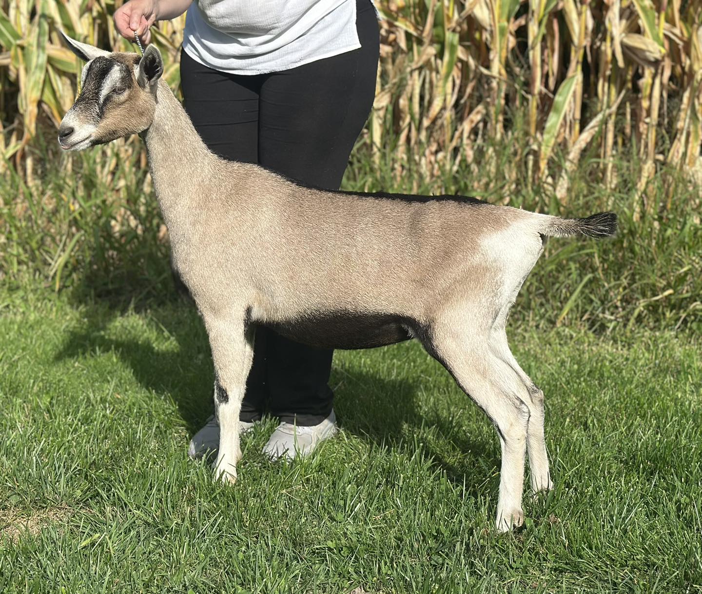 Aja is long, tall and level. She earned 3 RCH jr wins this year and placed 3rd at the MN State Fair. She has excellent combo of dairy and strength, correct feet and legs, a wide and level rump. She is tightly line bred on CH Pleasant Grove Zorro Jamboree who appraised 91 twice, has a top lactation over 4000, and is a strong brood doe with a recent USDA Elite son, an EX91 daughter, and several EX90+ granddaughters with lactation over 3000 lbs. We especially expect Aja to be a fantastic milker with her dam near 4000 and well over 4% BF and linebred on a 4000 lb milker as well. She has been bred to Arul for mid March kids. All kids will be available and could be an especially great choice for herds looking to add production with all of the high production animals in her pedigree.